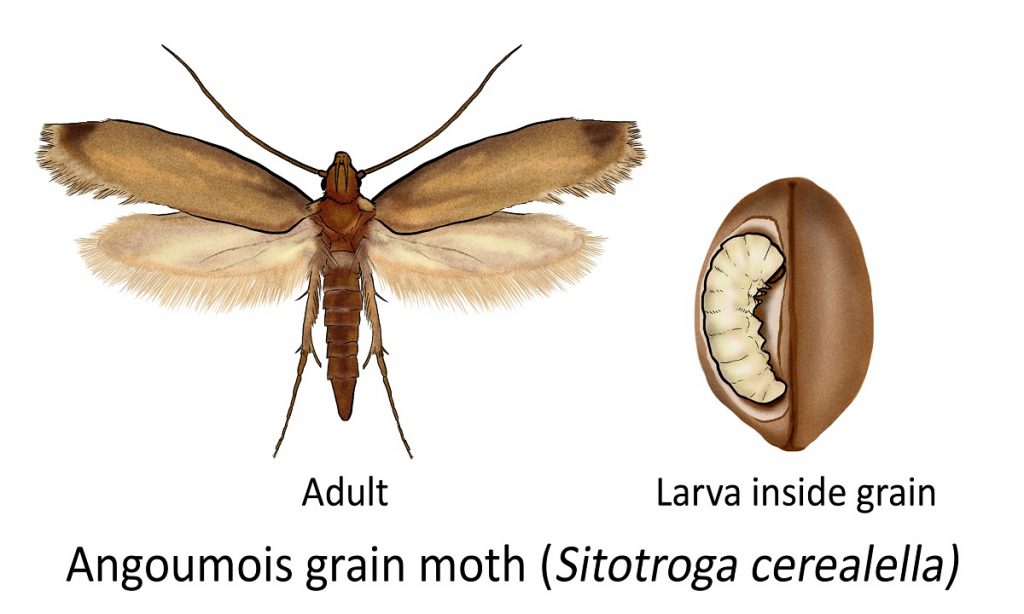 Adults emerge from the grain, leaving a silken “door”still attached to the grain. They only live to reproduce, and they do not eat.