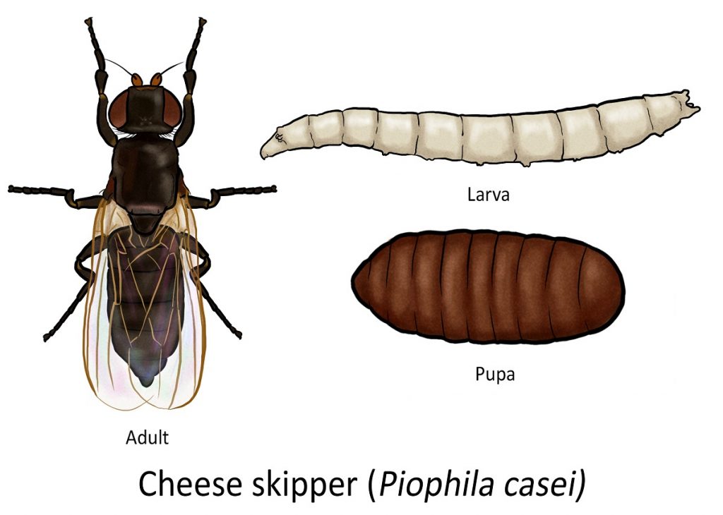 Larvae are 6–8mm in size depending on the instar. They are cylindrical and white, except for the dark mouthparts. They are named after the fact that the larvae can leap 10–15 inches through the air by using their mouth as grapples and then jerking themselves forward.
