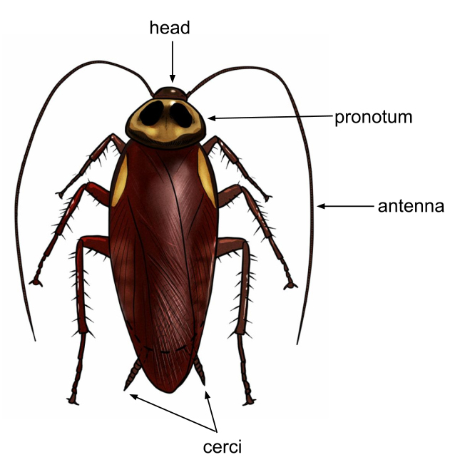 Adult cockroaches are medium to large insects that range from 7 to 50mm depending on the species. When viewed from above, they have a flattened oval-shaped body that allows them to squeeze into cracks and crevices. They have visible pronotums, which is the big shield-like structure that is often mistaken as their head. The head is located right underneath the pronotum, and is equipped with chewing-type mouthparts that allows them to feed on most types of food. Attached to their head is a pair of  usually long thread-like antennae. Their legs have protective spikes that aid them in crawling and running on a variety of surfaces, and their wings can either be present, reduced, or absent. They often have prominent cerci attached to their abdomen, which are sense organs present in both male and female cockroaches.