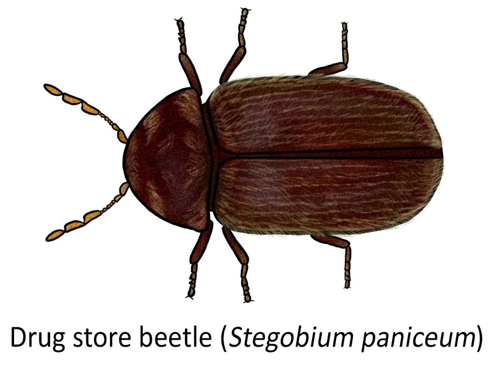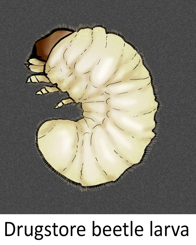 Adults are 3–4 mm, brown, and globular. Very similar to the cigarette beetle but the last three segments of the antennae form a loose club. Elytra with fine longitudinal ridges and fine hairs. The larva is scarabaeiform or C-shaped and fully developed legs.