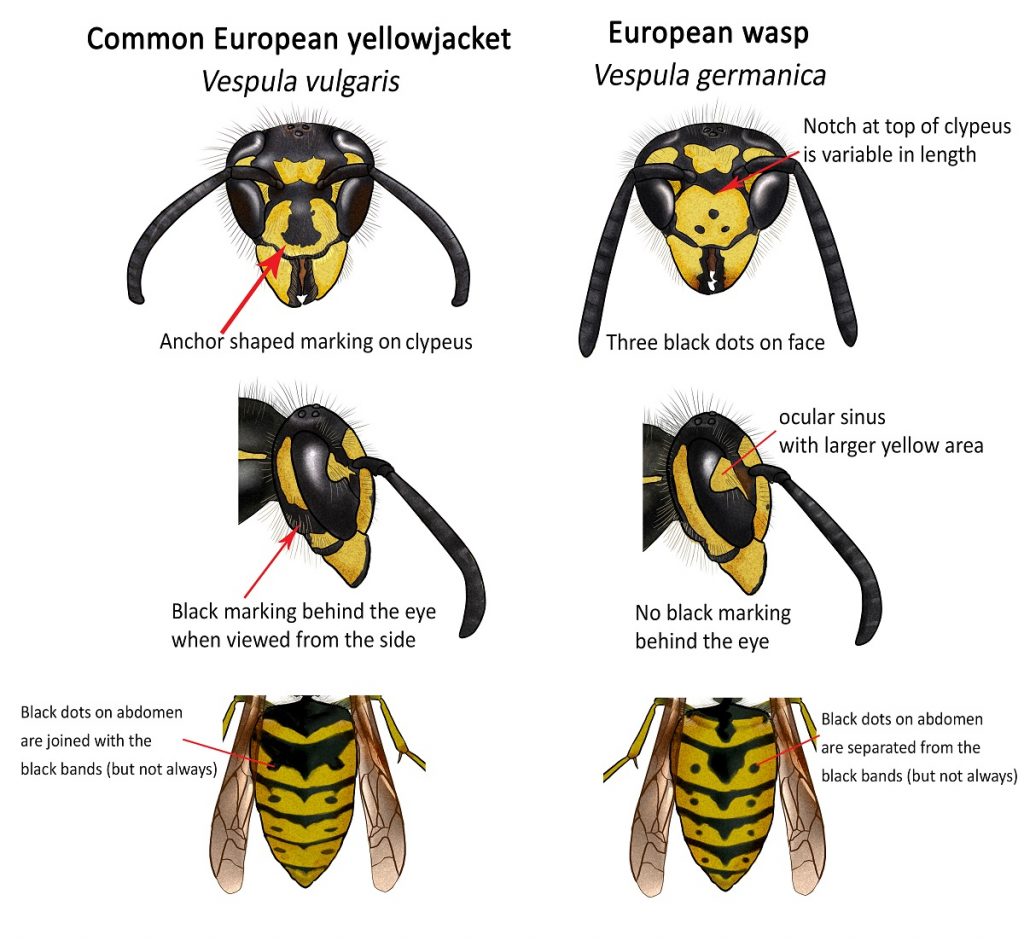 12–17 mm in length and yellow and black in colour. The queens are workers look very similar to V. germanica, but can be differentiated by the markings on their heads and abdomens.