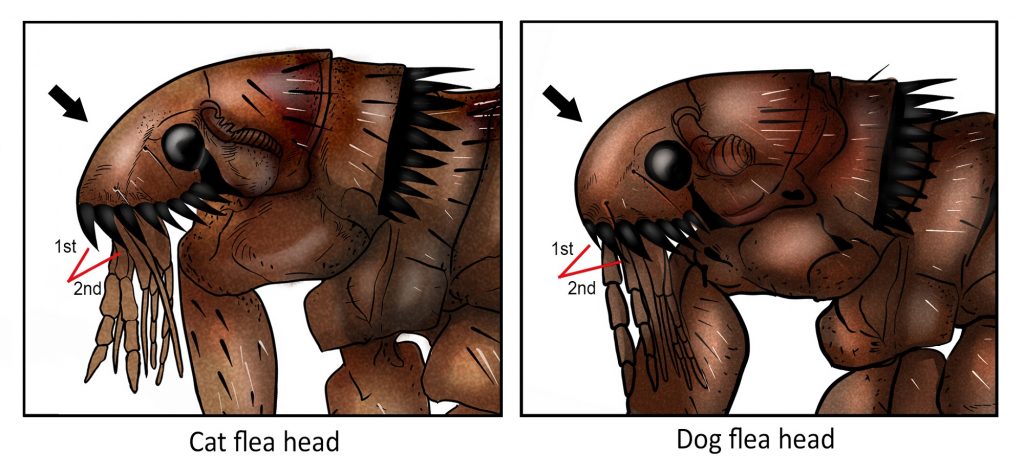 Cat and fleas are very similar in appearance but they have a few defining characteristics that separate them from one another. The most obvious characteristic is the shape of their heads. The dog flea has a more rounded head and its length is less than twice its height, while the head of C. felis or cat flea is more elongated and the length is twice its height. Moreover, the size of the first two spines of the genal comb (“teeth-like” structures above their mouth) is also different between the two species. The first spine genal comb of C. felis is approximately just as long as the second spine, while in C. canis, the first genal comb is noticeably shorter than the second.