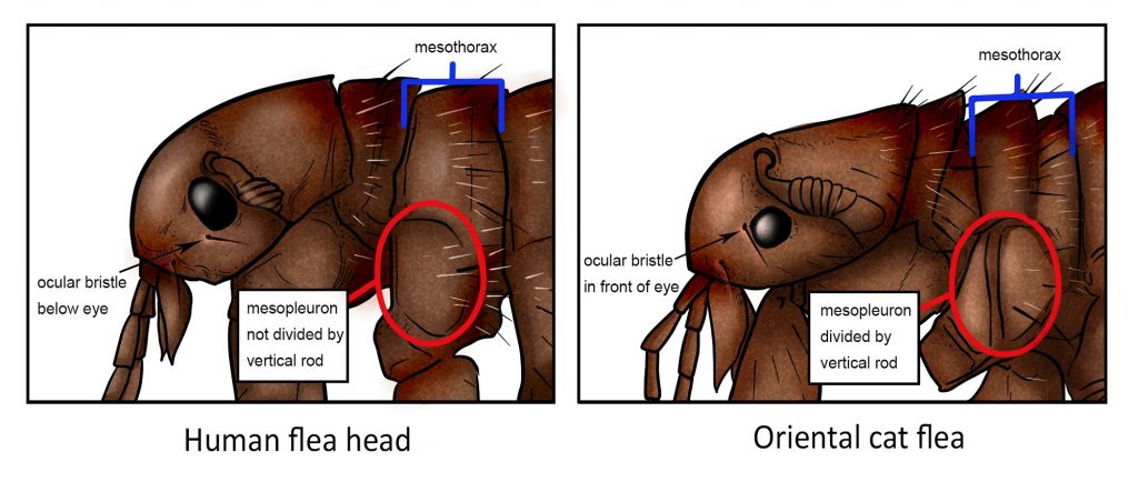 The human flea and the oriental rat flea look a lot alike at first glance and have very subtle morphological differences. Unlike the cat and dog flea, they do not have any genal and pronotal combs. The human flea has an ocular bristle below its eye, while the oriental rat flea has an ocular bristle in front of its eye. In addition, the mesopleuron of the mesothorax (second thoracic segment) of Xenopsylla cheopsis is divided by a vertical rod-like internal sclerotization, while the mesopleuron of Pulex irritans is not.