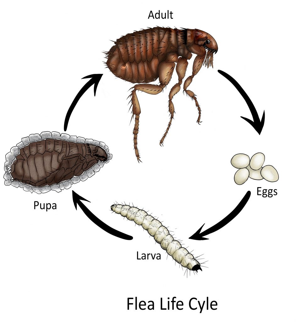 Fleas undergo a complete life cycle; they have a number of developing stages starting with the egg, followed by a larva, pupa, and finally the adult. In most species, males and females are not reproductively ready when they first emerge the pupa and immediately need to feed on blood to mature and proceed with mating.