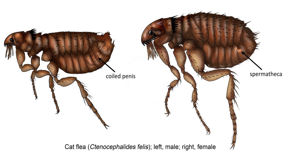 Fleas are very small insects. Adults are 1.5 – 3.3 mm long, and are reddish-brown in colour. Their bodies are “bilaterally flat” or are flattened sideways which allows them to move through their hosts’ fur or feathers, and their strong claws keep them in place. They are wingless insects but have very strong hind legs that enable them to leap 100 times their body length. Their mouthparts are adapted to pierce and suck blood from hosts.