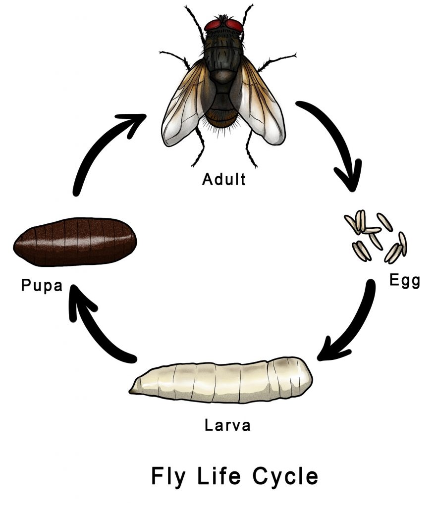 Flies undergo a complete life cycle with four stages: egg, larva, pupa, and adult. The female lays eggs somewhere with an abundant food supply and has no involvement in the care for her offspring. The number of eggs the female lays depends on the species but it can range from several to hundreds. They lay eggs in clumps or singly, in or near water, or attached to other things. After a few days, the eggs hatch into larvae which look like tiny worms that are cream in colour. They undergo several moults or instars prior to pupation. The larval stage takes up to two weeks to several months. The pupal stage of dipterans varies in shape and size.