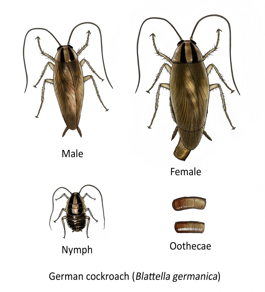 The German cockroach (Blattella germanica) is probably the most widespread and successful cockroach that coexists with humans due to its small size and short life cycle, taking as little as 40 days to develop from hatching to adulthood. This cockroach seeks out moist and humid environments with ample food sources. They are commonly found in food manufacturing facilities, warehouses, storerooms, restaurants, cafes, hospitals, domestic kitchens, under sinks, behind refrigerators, and most types of indoor environments and buildings. The German cockroach is nocturnal. Adults and nymphs find cracks and crevices to hide in during the day and become more active at night. However, if numbers are seen crawling that daytime, especially in non-food handling areas in a building such as bedrooms, it can be assumed that the building is highly infested and immediate control measures should be taken.