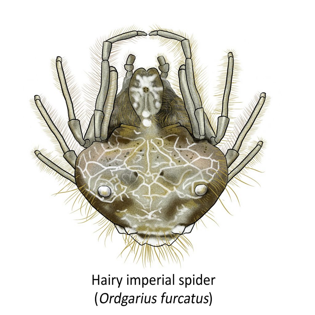 Male is 2–3 mm; female is 10 mm. Dull brown in colour with light brown wavy patterns. Has a bulbous body with 2 prominent tubercles on the dorsal surface of abdomen.