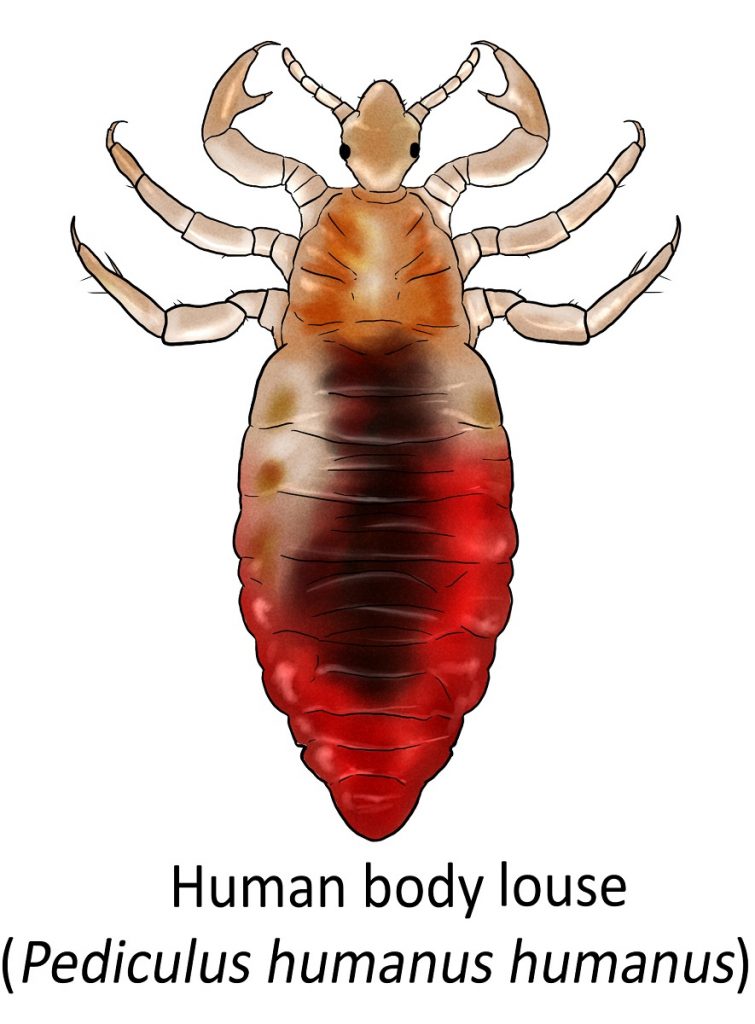 Egg/Nit: White or yellowish brown in colour and oval in shape. They might not be seen on the skin but rather in the seams of clothing. They hatch within 1–2 weels.