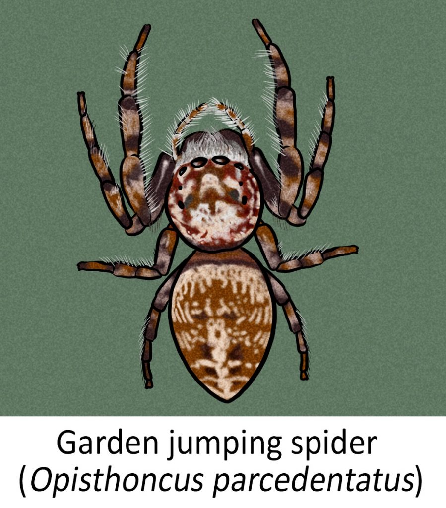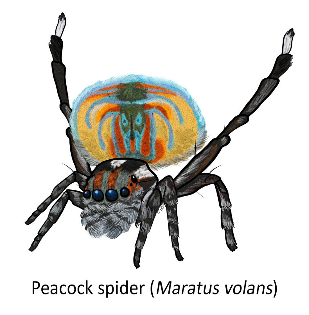 hey are generally small; females are about 10 mm long, while males vary in size depending on the species. They have large eyes, impressive jumping ability, and brilliant colour. The males are more colourful and patterned than the females. A good example of this is peacock spiders (Maratus spp.) found in southern Australia.