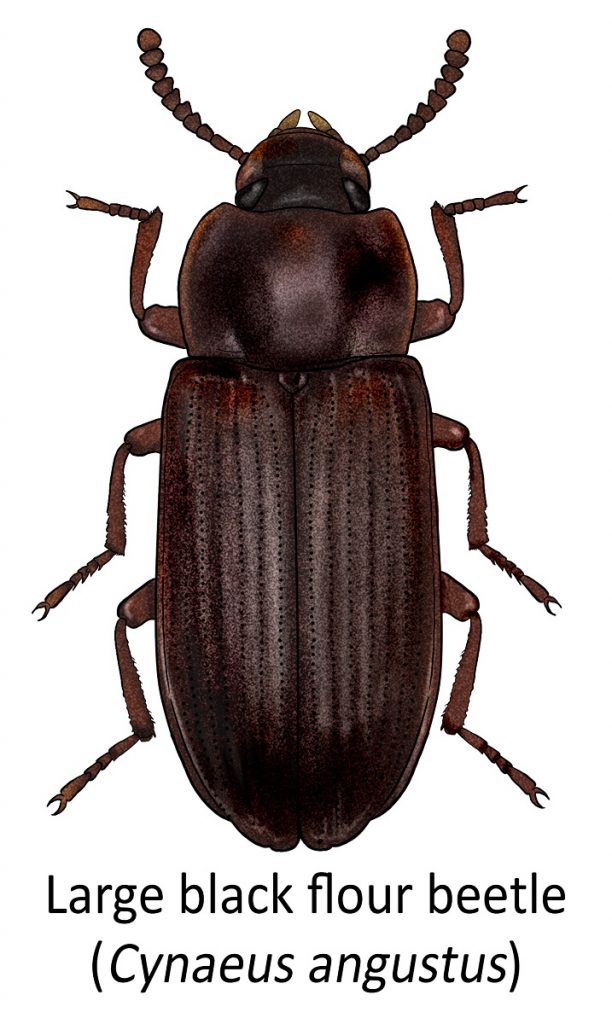 At optimum conditions of 30 ℃ the life cycle will be completed in 30-40 days. The eggs are laid in commodities. The larvae are mobile and feed externally. The adults live long, feed on the commodity, and fly.