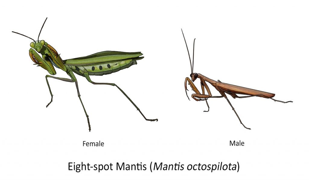 Mantids are easily recognised through their distinctive “praying” stance, which they do in their ‘sit and wait’ predatory behaviour. The remarkable precision with which they capture their prey, together with the notorious tendency of some female mantid species to eat their male partner during mating, undoubtedly earns these insects a reputation as the “ultimate predators” in the insect world.