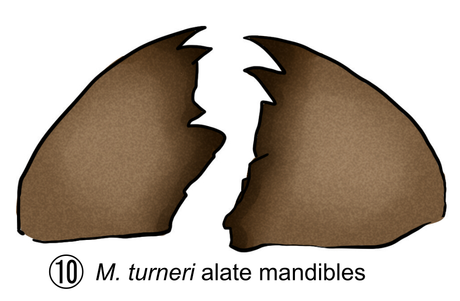 - Mandibles black, moderately serrated, strongly curved, and shorter than head;