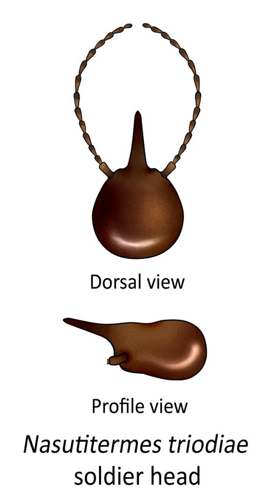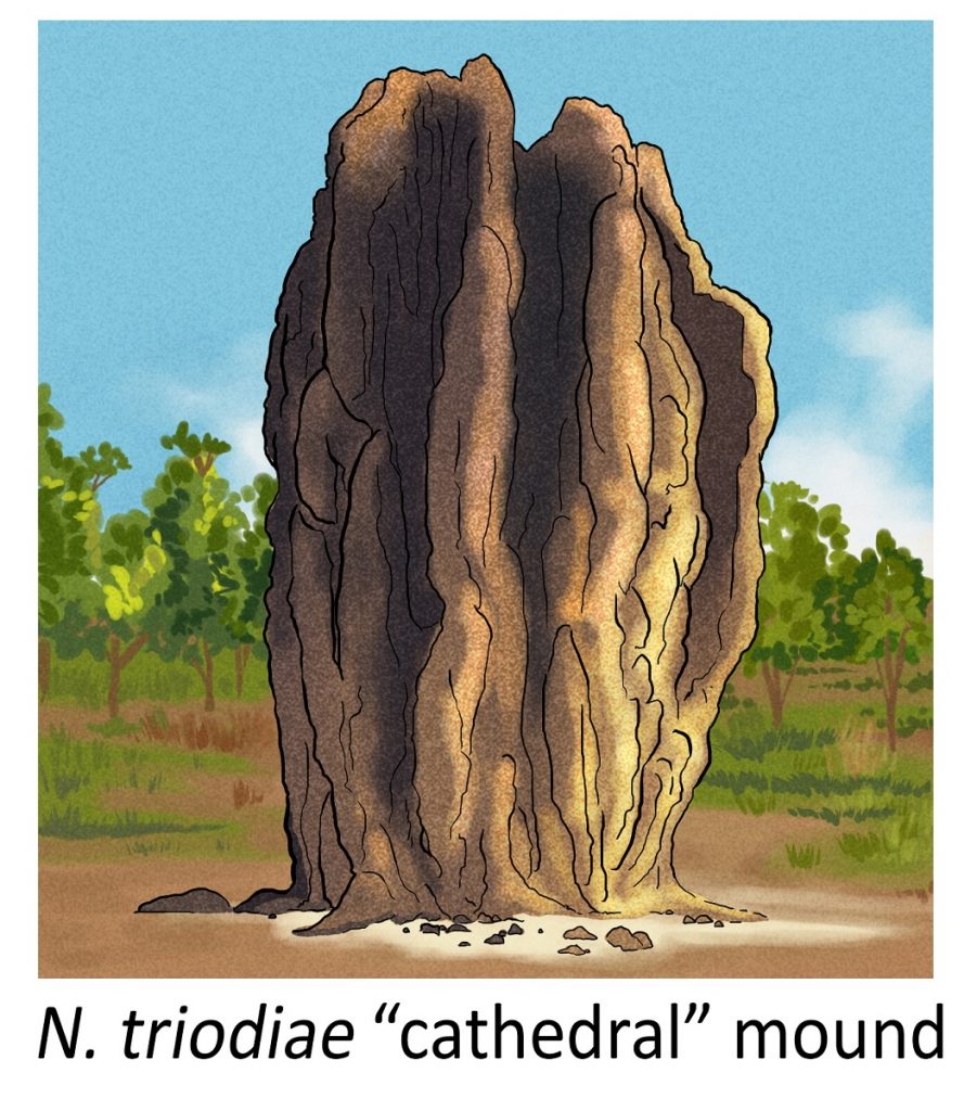 This species is known for its nest building. Nasutitermes triodiae makes large size nests with various forms that depend in locality. Its nests reach a maximum height of about 4 metres and at ground level, a diameter of about 3 metres. Many of its nests re irregular cone or dome-shaped. Others are narrowed at the base, with distinct overhanging sided that often extend downwards to the ground.