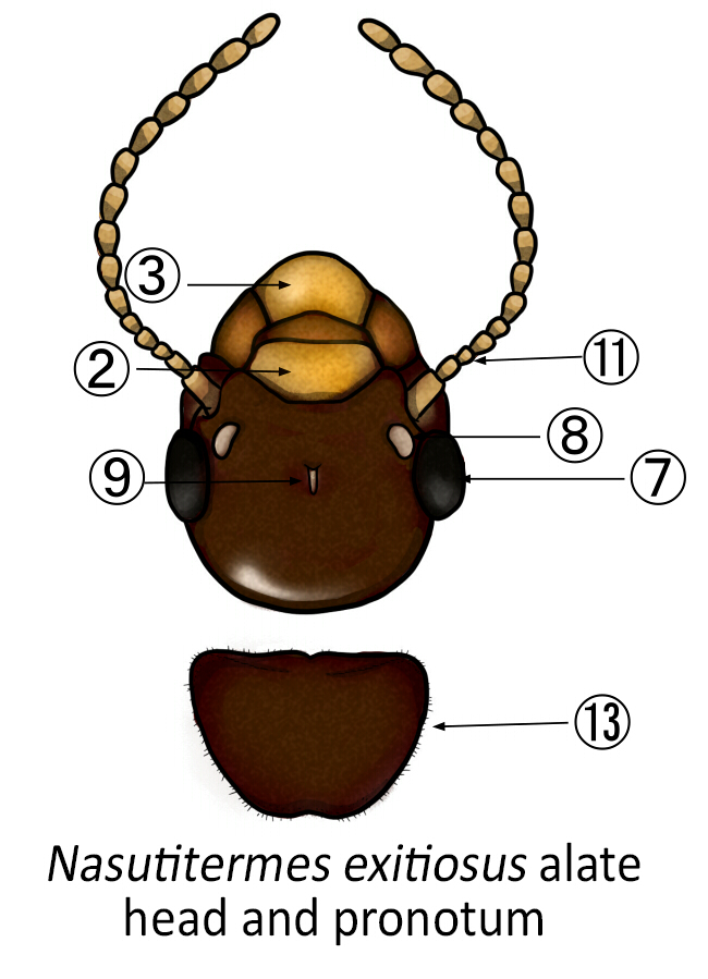 Alates. Winged adults measure 15.50–17.50 mm with wings, and 6.50–8.50 mm without wings.