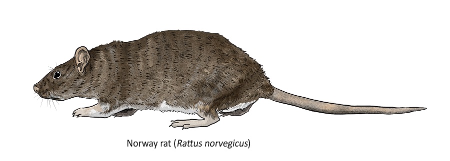 The Norway rat, also known as the brown rat because of its bristly brown fur, is the largest among the other rodent pests, averaging 40 cm in total length (including its tail). It weighs about 400- 500 grams, and the males are generally larger than the females. It has a blunt nose, small eyes, small bald ears, and a tail shorter than its body length. It is capable of burrowing, running, jumping, and swimming, but is a poor climber due to its large size and is usually found on lower floors of buildings.