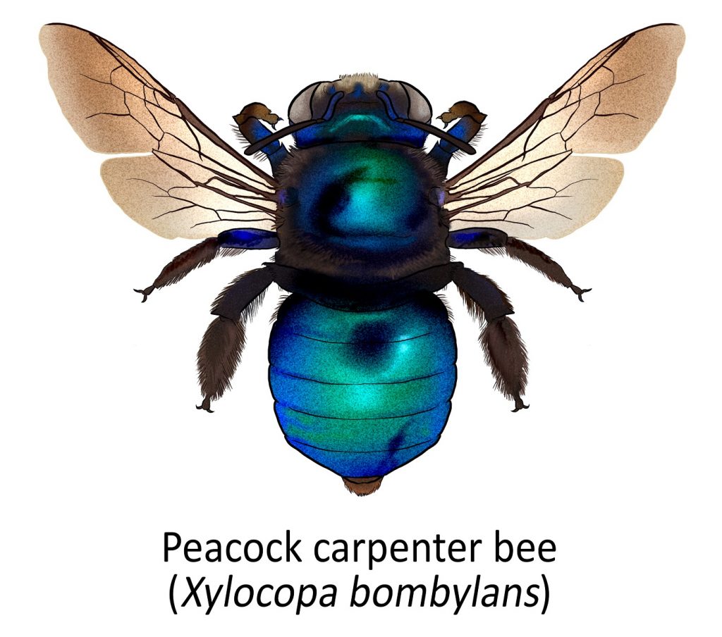 16–18 mm in size. It has a bright shiny metallic blue-green colour that may sometimes appear purple or yellowy green depending on the direction of light. They produce a deep droning noise when they fly, which may seem threatening but carpenter bees are docile unless bothered. Males do not have a sting, females do.