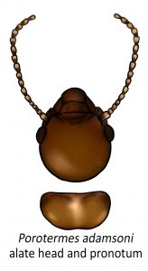 Alates measure 14.25–17.17 with wings, and 8.00–11.00 mm without wings. Their heads are darker than the rest of their body. They have long and slender antennae of 15–18 segments. Pronotum about as wide as head, and about half as long as wide. Their tibial spurs are variable. The fore tibia has 3 spurs, mid tibia may have 3 or 4, and the hind may have 2, 3, or 4 spurs.