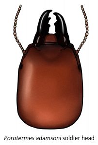 The soldiers are and are 10.0–14.0 mm in length and have mandibles that are a third of the head length. They have flat rectangular heads and pronotums that are more than half as wide as the head. They have antennae with 15–18 segments. The tibial spurs are variable. The fore tibiae have 3 spurs, mid tibiae may have 2, 3, or 4 spurs, and hind tibiae with 2 or 3 spurs.