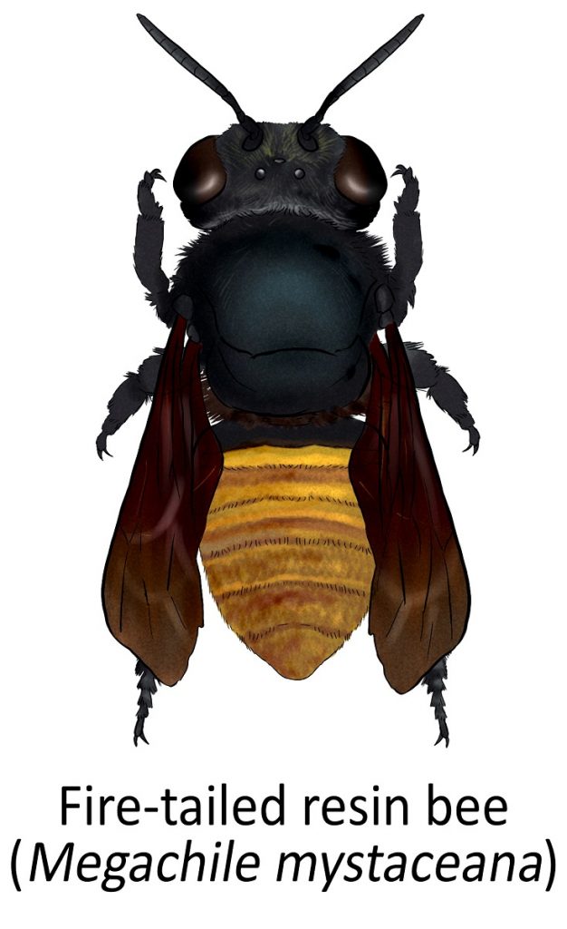 7 mm long, small bees. There are over 80 species in Australia. They have a glossy black head and thorax. Their abdomen is wedge-shaped when viewed on the side and is either black or red-orange in colour. Some species also have a light T-shaped marking on their face.