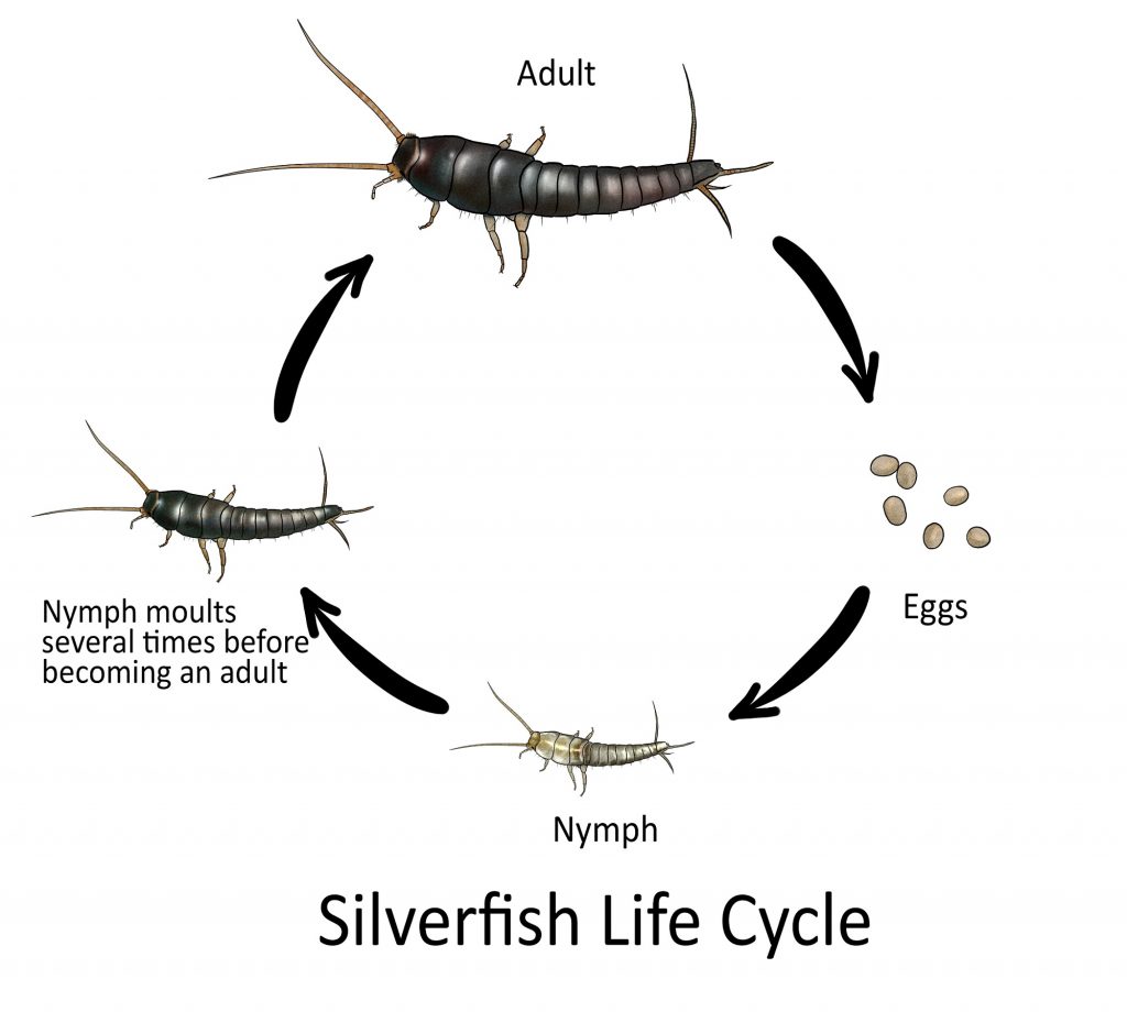 Silverfish are ametabolous, meaning they undergo no metamorphosis or transformation. The females lay eggs singly or in small batches, and they hatch in 2–8 weeks. The nymphs closely resemble the adult and undergo 6–7 times before they reach sexual maturity which can take anywhere between 3–24 months. Silverfish continue to moult throughout their life, which may be as long as four years.