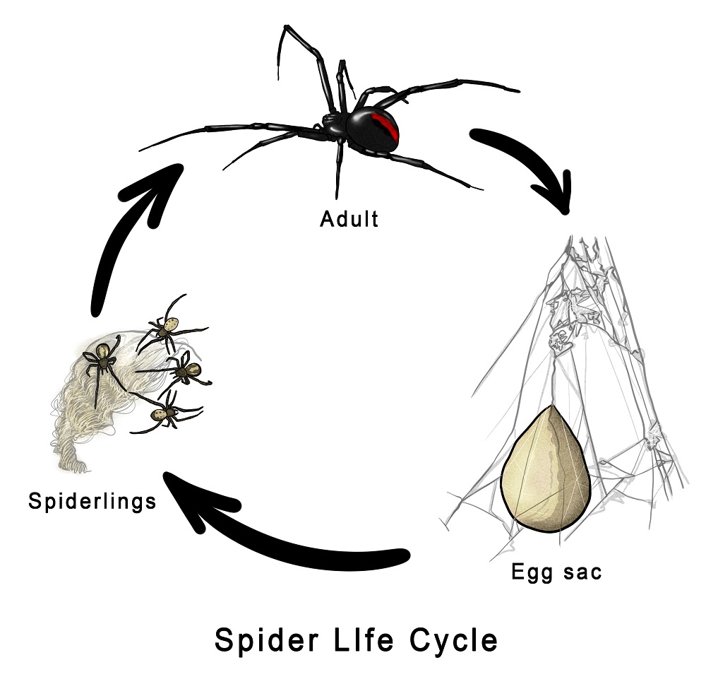 Spiders undergo three developmental stages: eggs, spiderlings or the immature stage, and the adult stage. Female spiders are bigger than male spiders, and they can also be more powerful and dangerous. Prior to mating, the adult male spider will spin a web where it would discharge sperm and transfer it to syringe-like structures on its palps. The male then looks for a mature female to engage in a courtship ritual with, and these rituals vary depending on the species. After a successful courtship, the male transfers its sperm from its palps to the female’s genital opening on the underside of its abdomen. In some species, the female eats the male after mating.