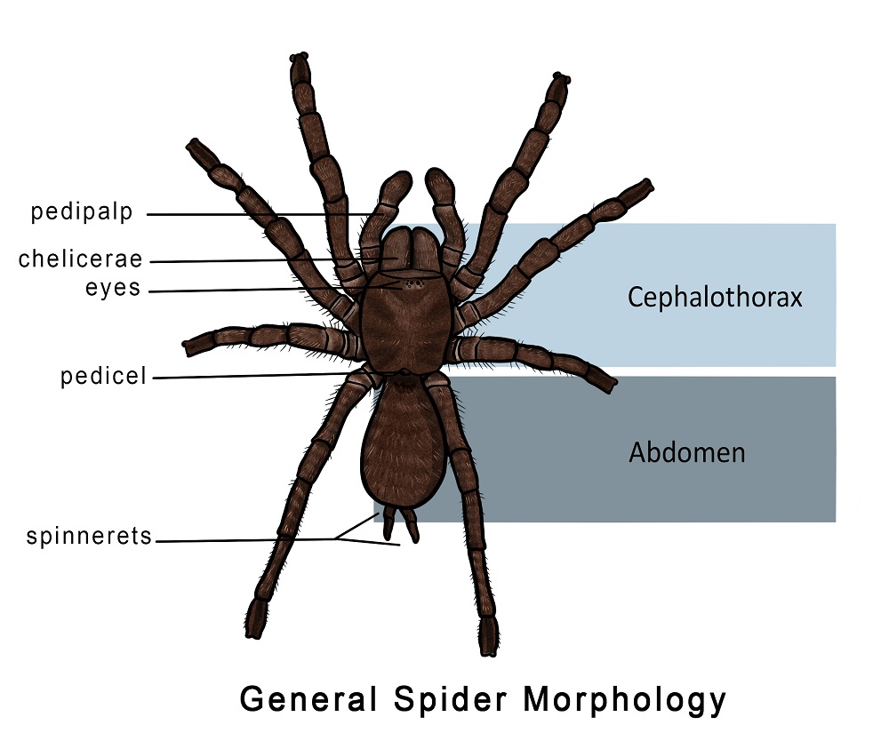 Spiders belong to the Order Aranae, the largest order of arachnids. They have eight legs, and usually have eight eyes  (some have six or fewer) each equipped with a single lens. They have  chelicerae with fangs that enable them to inject venom into their prey, pedipalps, and silk-spinning organs at the tip of their abdomen called spinnerets. Their two body regions, the cephalothorax and the abdomen are joined by a cylindrical pedicel.