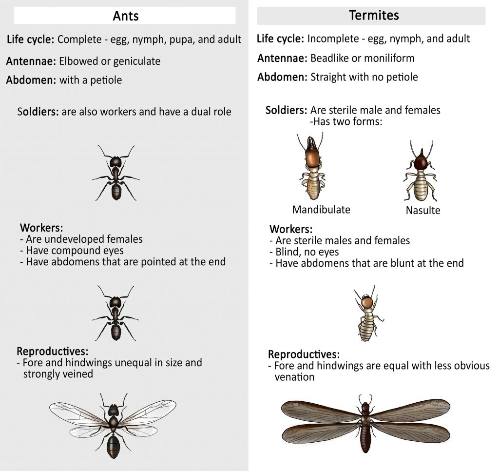 Termites are white to brown in colour, have straight beaded antennae, and have a straight abdomen. Their reproductives have equal-sized wings. Ants, on the other hand, vary in colour depending on the species, have elbowed antennae, and have a “pinched waist” or a petiole. Their reproductives have unequal wings; the forewings are bigger than the hindwings.