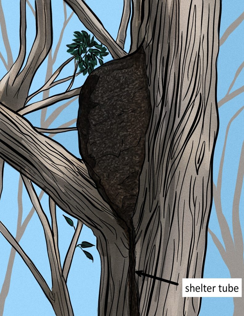 This type of nest is built on trees and may be about 20m or more above ground. It is connected to another part of the colony located inside the root crown of the tree, and is connected by a shelter tube located on the exterior of the tree trunk. Termites use shelter tubes to attack decaying wood and to transport soil moisture to the nest. Nasutitermes walkeri and Nasutitermes graveolus are known to be the best arboreal nest builders. Microcerotermes turneri and M. serratus also build arboreal nests but they are monodomous or build a single nest unlike N. walkeri and N. graveolus
