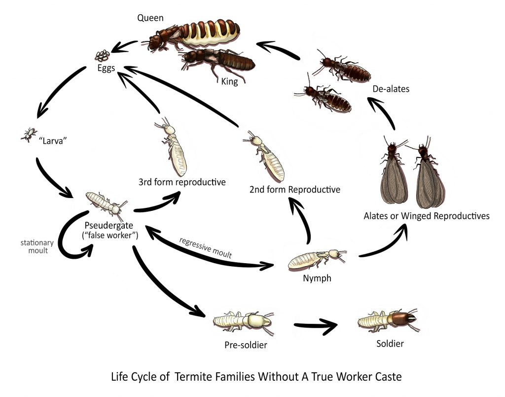 True workers are sterile, blind, and very pale individuals that do the most amount of work among the other castes. They forage, store food, feed the king and queen and all the other castes, take care of the young, and maintain the tubes and nests of the colony. Pseudergates are totipotent immatures with very little morphological differentiation. Their development is flexible because they can moult into any form of adult (soldier, secondary reproductive, tertiary reproductive, or an alate).