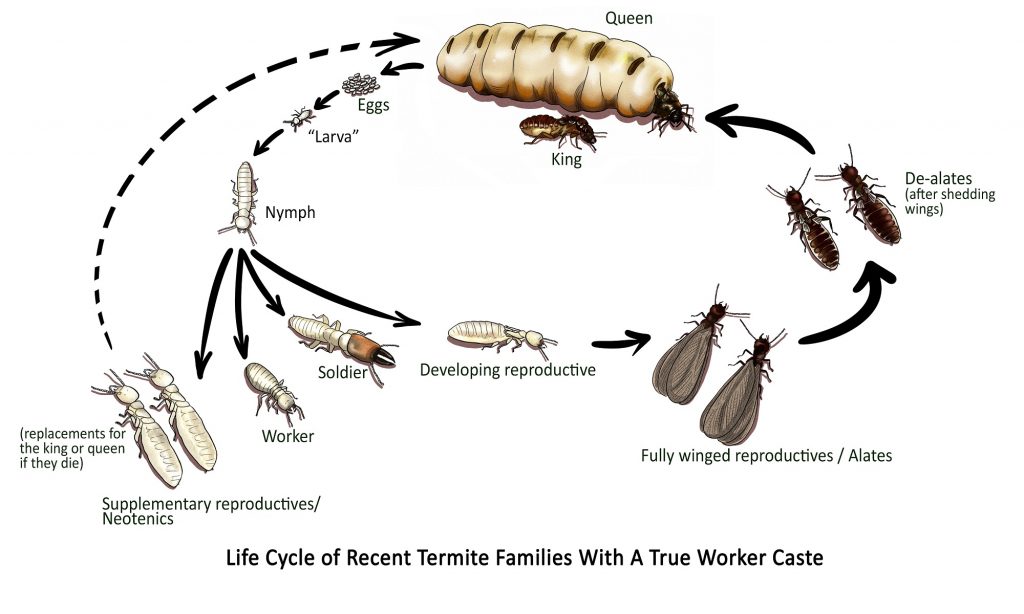 There are five termite families present in Australia. Three of the five families are primitive, meaning they do not have a true worker caste, and the labour done by workers is carried out by immature termites (pseudo-workers or pseudergates) which, when they moult do not have any significant change in their size. The other two families have recent worker cates. The diagram below shows the termite families and the termite species often encountered in the field.