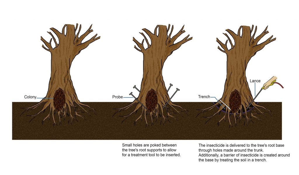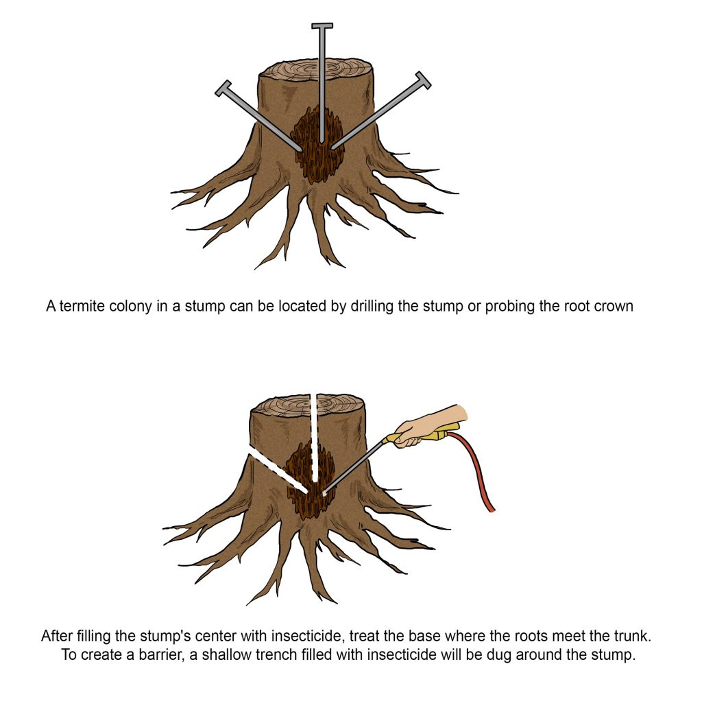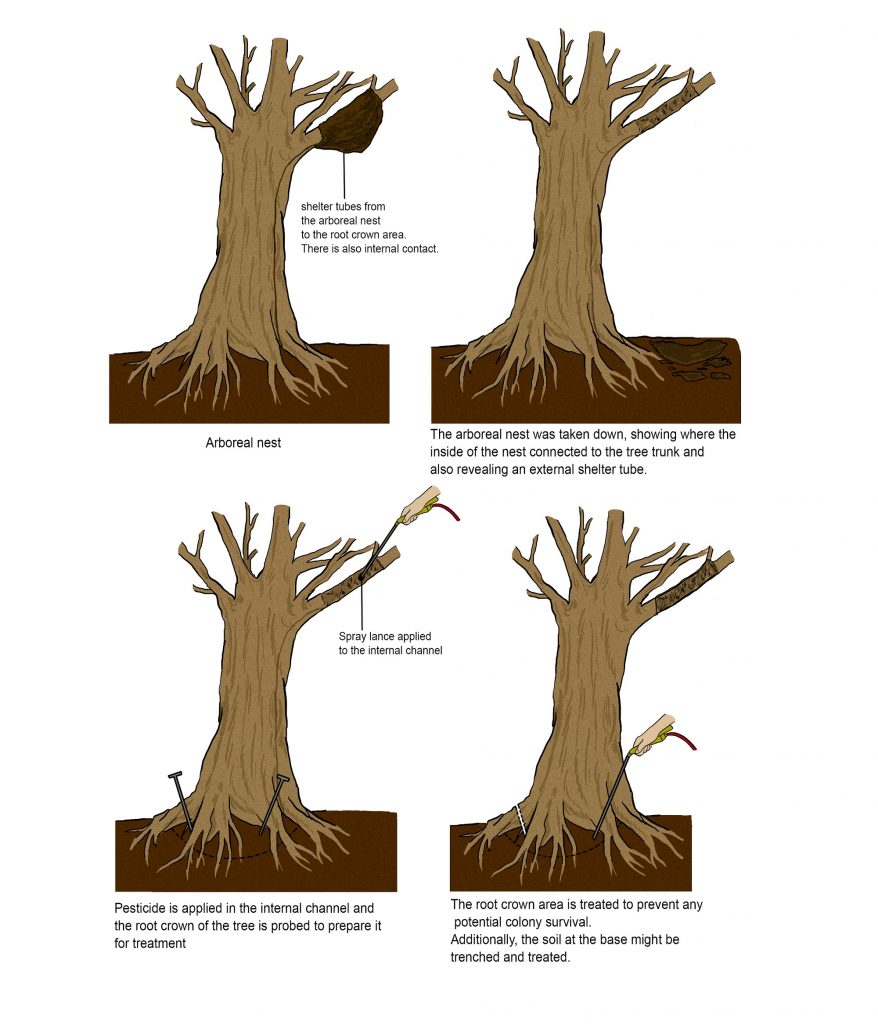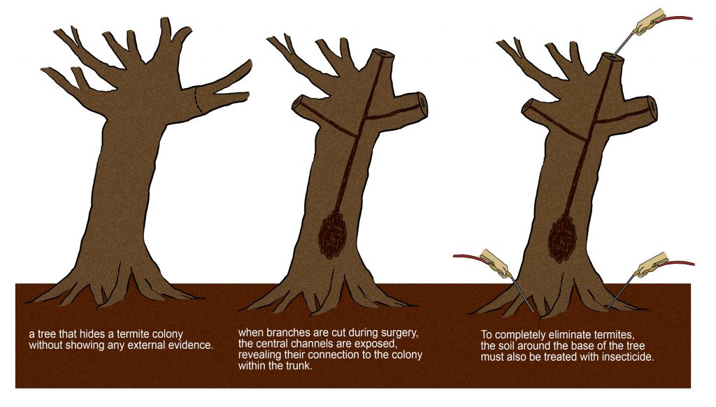 If a colony in a tree is found, a short-lasting insecticide can be used to kill the entire nest. This is a good option for both pest and non-pest termite species. However, the effect of this treatment only lasts a short time. The treated tree will eventually become attractive to other termite colonies searching for a new home. So while, this method gets rid of the current termite problem, it does not prevent future infestations.