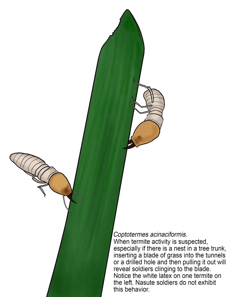Termite noises. Mastotermes darwinensis can be heard feeding on wood. Other termites can also be heard using a stethoscope or other sound-amplifying devices. An audible tapping sound can sometimes be heard from Coptotermes acinaciformis in response to tapping by a technician during an inspection. This is caused by soldiers tapping their heads and mandibles on the wood as a warning signal to the members of the colony.