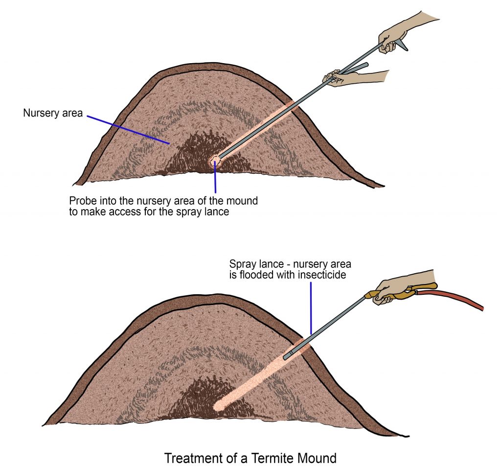 When dealing with multiple termite mounds that need to be destroyed, and their visibility is not an issue, using insecticides can be a more efficient and less labour-intensive method. While the type of insecticide is not crucial, proper application technique is key. Holes should be drilled through the mound’s tough outer wall and into the lower central structure of the nest. For dust application it is advisable to make several holes and ensure it puffs out of other holes, indicating it is reaching the entire nest.