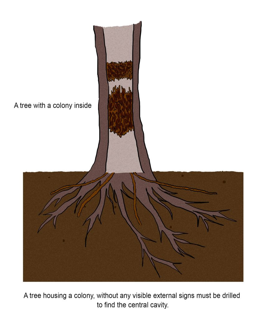 Tree nests. Arboreal nests are easily spotted even in early developmental stages. Some termite species make their nest in the centre of tree trunks or in the root crown area. Their presence can be confirmed by callous tissues or exposed workings where a branch has been broken off. Coptotermes frenchi, Schedorhinotermes intermedius, and sometimes Coptotermes acinaciformis build nests in the subsidence area right under the root crown. When a metal rod is probed in the centre of the tree, there will be a sudden lessening of resistance as it enters the softer material. If the rod is left for a period of time and then pulled out, the rod would be warmer than the outside temperature.