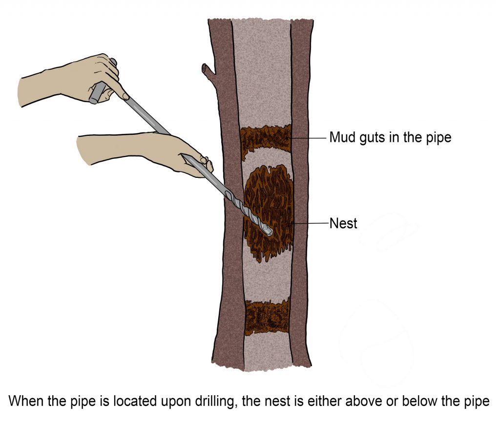 When drilling holes into tree trunks, stumps, or mounds for insecticide application, it is important to drill at a downward angle. This ensures that gravity aids in delivering the insecticide into the nest, making the process more effective.