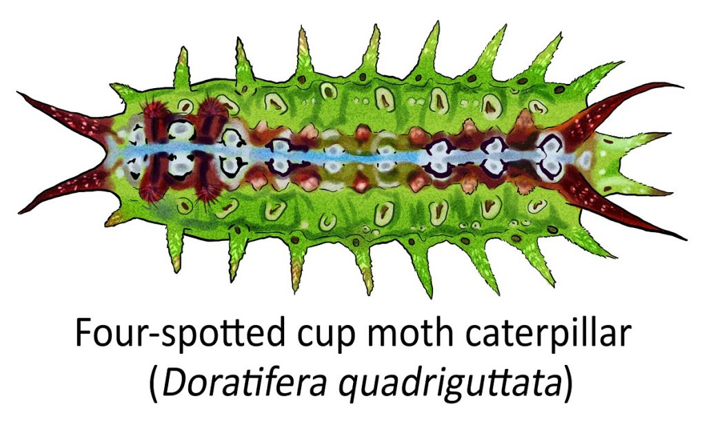 20 mm in length. Has a pale green body with patterns of black, white, pink, and green markings on its back. It has eight green spikes on each side and a pair of pink spikes on both front and rear ends. It has four hidden red spikes with stinging hairs that will erect with when disturbed.