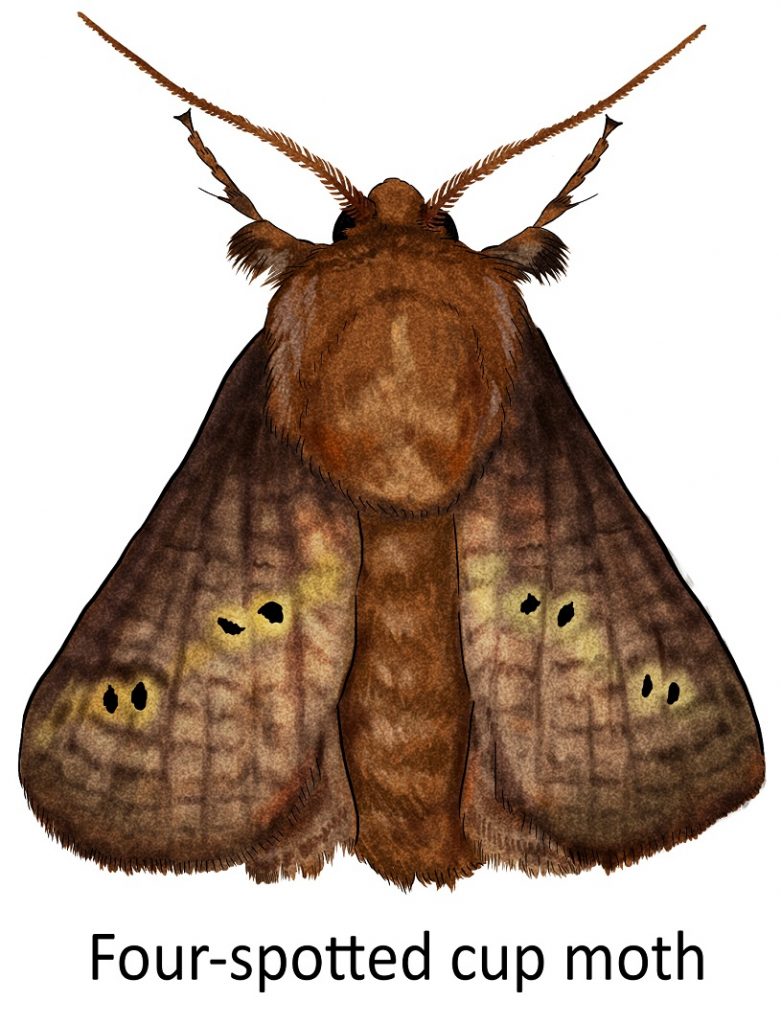 It has as wingspan of 30 mm. The body is uniformly brown and each forewing has a row of four black dots (sometimes more).