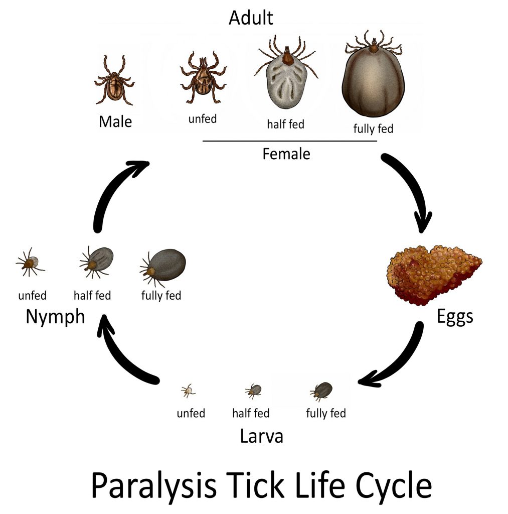 Ticks go through four life stages— egg, larva, nymph, and adult. After hatching from the eggs, the larvae must eat a blood meal to grow and move on to the next life stage. Female ticks need a blood meal in order to produce eggs, while males do not feed on blood and do not attach themselves to warm-blooded hosts. The life cycle lasts 2–3 years; most will die because they cannot find a host.