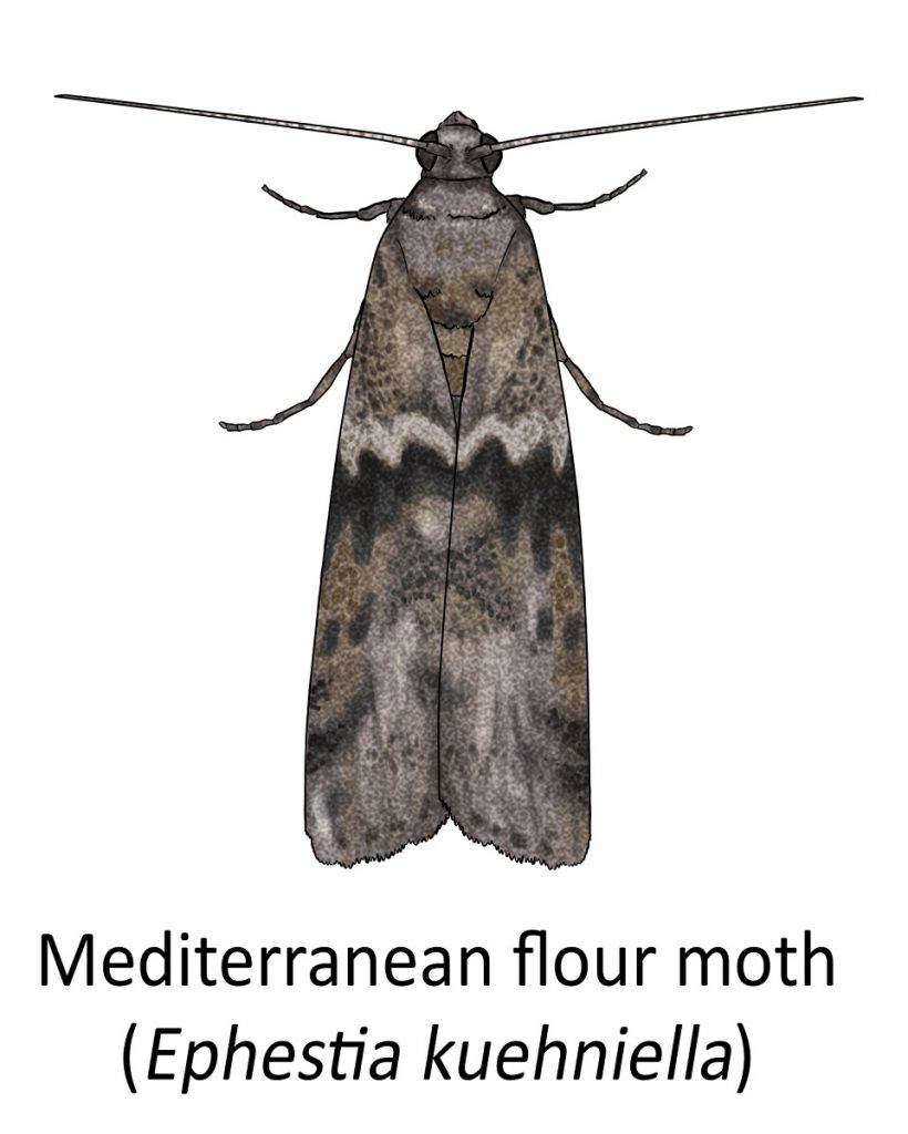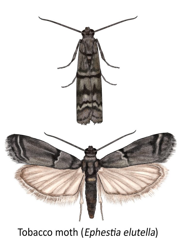 E. kuehniella is larger with a 15–26 mm wingspan, and more clearly marked.