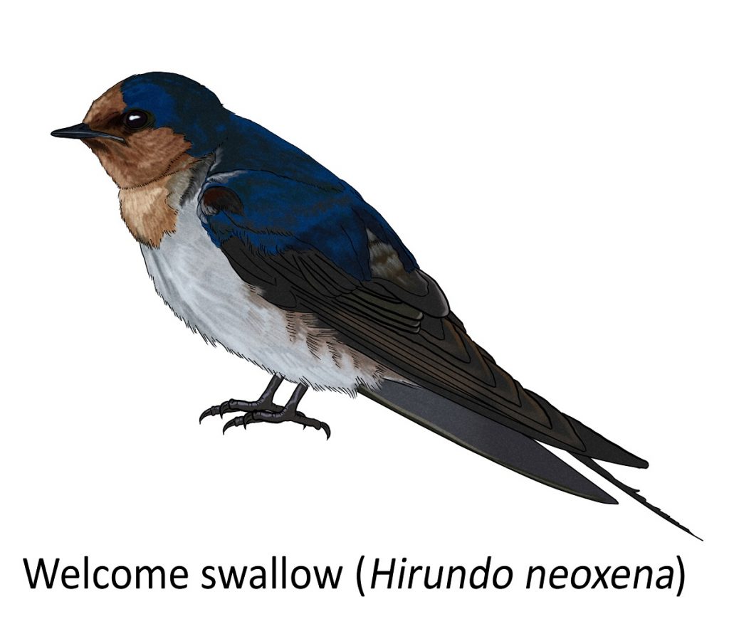 Brownish red face and throat; steel-blue coat and light-coloured belly. The tail is forked.